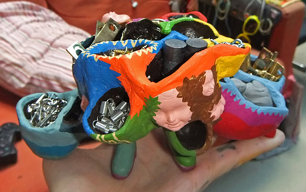 I quickly whipped out a set of mini-fridge magnets, using “FIXIT” (a two part putty for tool repair that also works great for making things) applied directly on top of a little ceramic magnet that I got a 10-pack of at Home Depot for $2 or something like that. Here they are next to a quarter and a penny for scale, and if you want to see close-ups I put some after the break. Oh, and starting top-left and going clockwise, they are: a Jason-type hockey mask wearing psycho, some sort of creature akin to a “real life” Pac-Man, a dog (duh!), and a puffy-nosed drunkard. I don’t know why, but I find myself drawn to miniatures right now and feel a real sense of accomplishment — I can understand why people get off on carving pencil leads although I do think that writing on the edge of a razor blade may be a bit far in kooky territory.