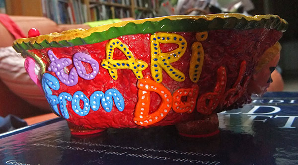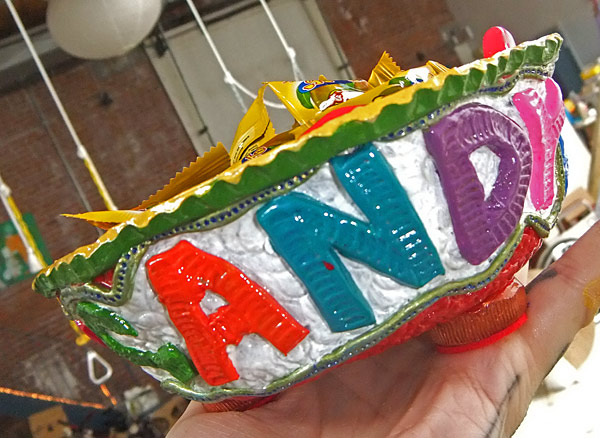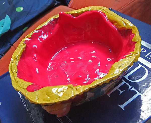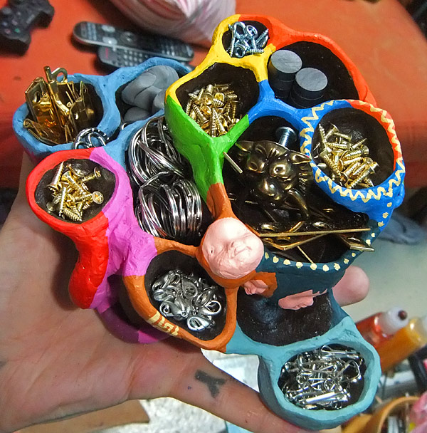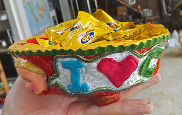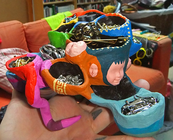 The second is a candy dish that I made yesterday, as a preset for Nefarious for her 8th birthday. Caitlin and I happened to find her favorite candy, the one that they give out at the sushi place down the street that we frequent, so I thought it would be nice to present it like this. It’s made out of Apoxie Sculpt and then painted and glossed. Quick and friendly. The star on the facepaint looks wonky in the photo but it’s fine in real life… I think I must have just captured it at an odd angle.