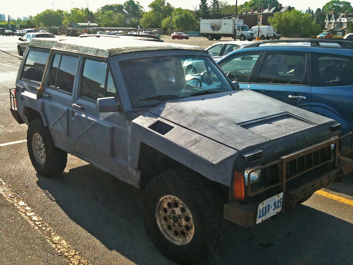 Other than that, there are a few trucks like mine — big lifted Jeep Cherokees — in this neighborhood and I snapped this pictures of one of the more interesting ones this morning as I was waiting for the pharmacy to open. Click to zoom in if you’d like a closer look.