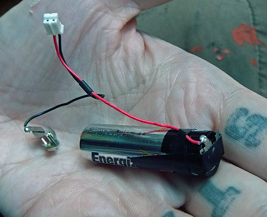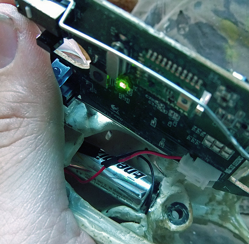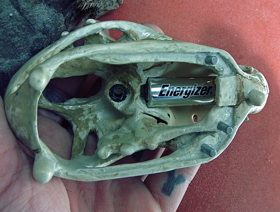 The battery luckily fit almost perfectly into the nose of the skull. The positive terminal is taped in place only out of convenience — both terminals are actually just pressure fit in place. I have to admit that with all the work I’d done I was nervous that I could have damaged the electronics. It was a relief to see that little green LED come on and discover that it worked perfectly!
