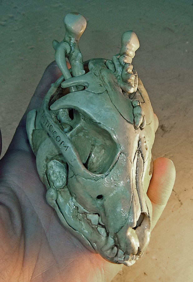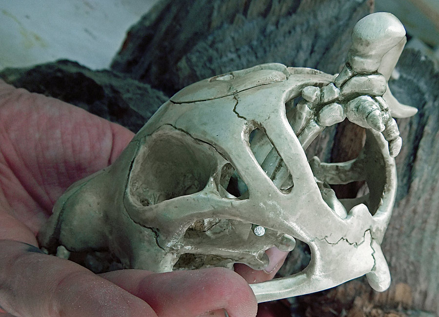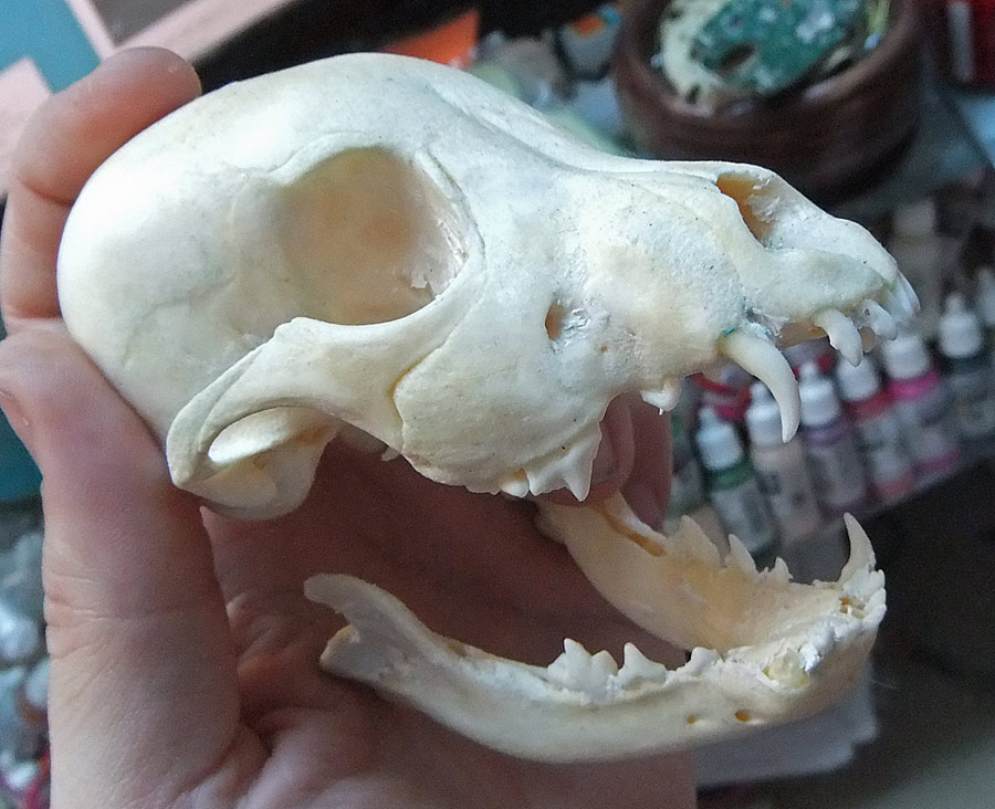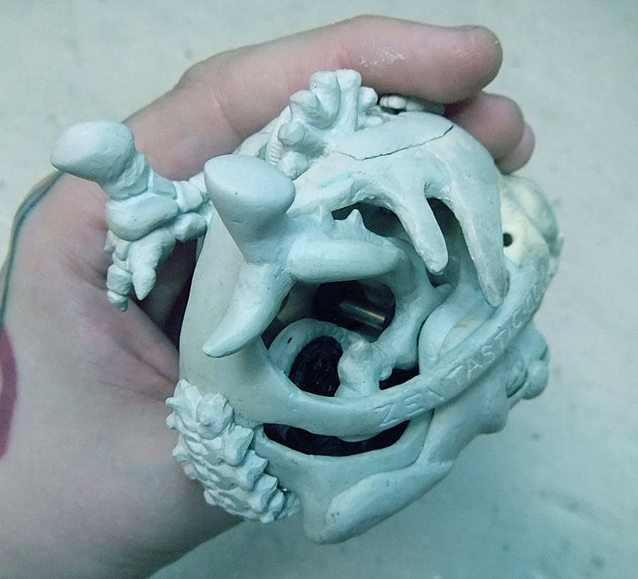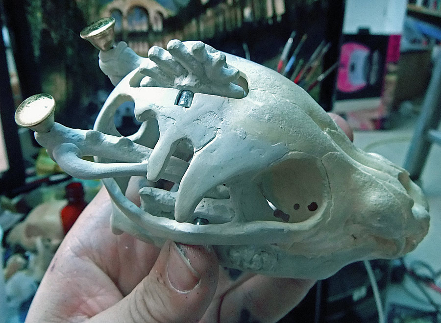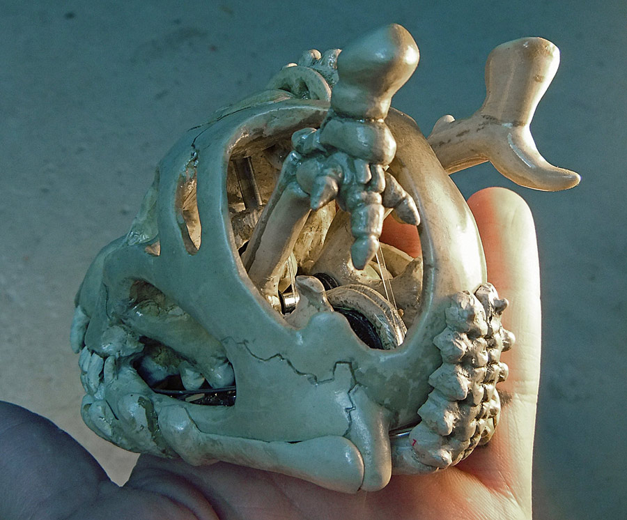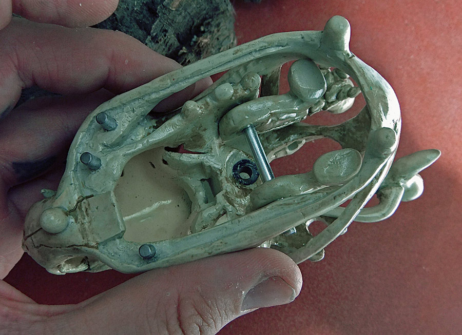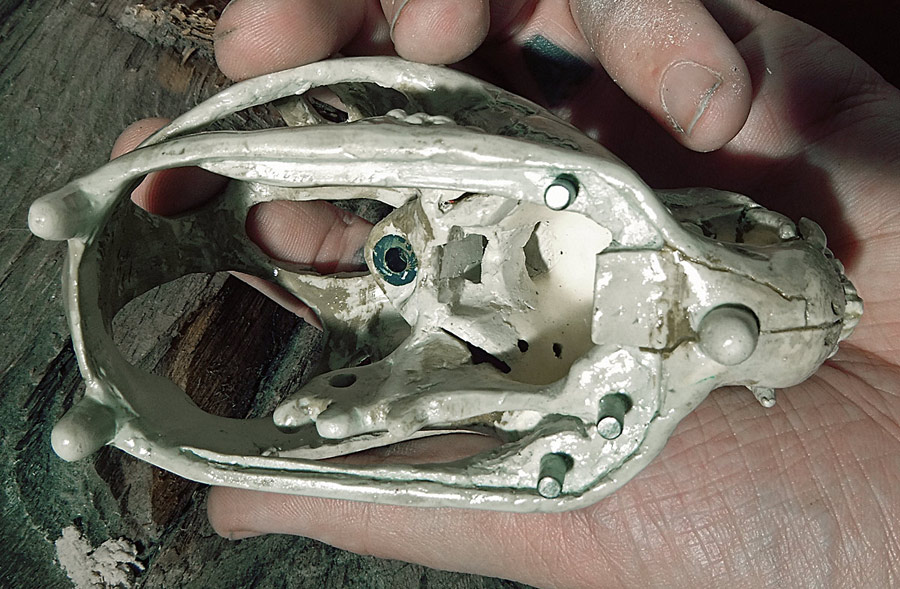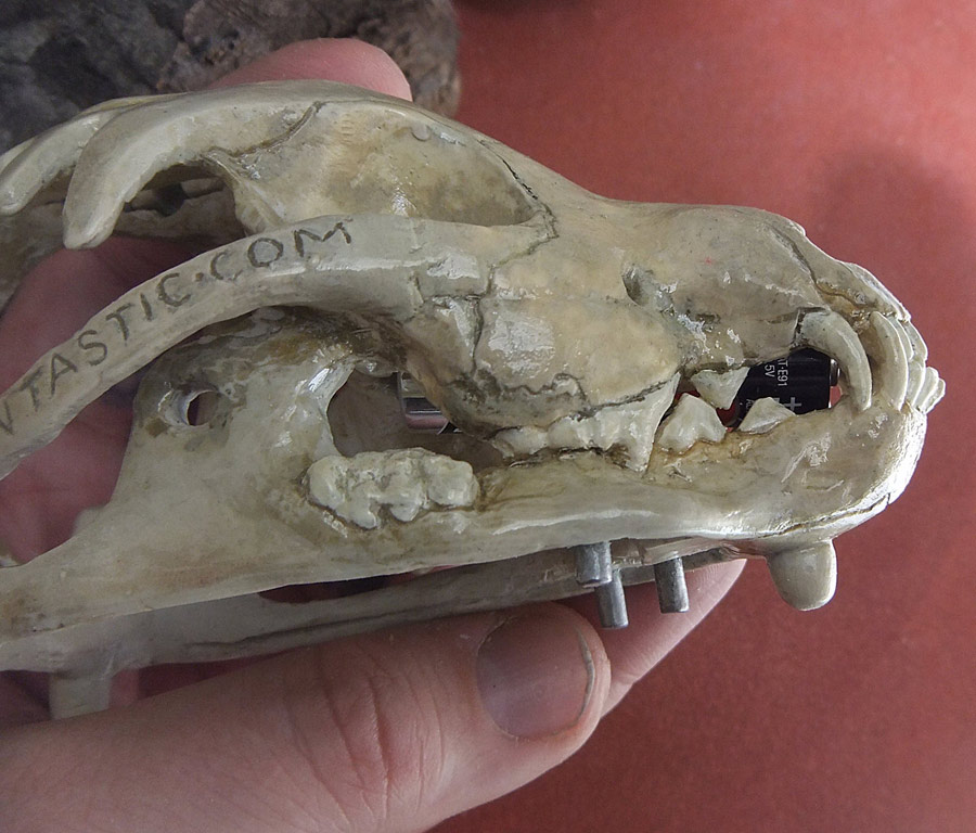 All the pictures in this entry (and after the break there are a small mountain of them) can be clicked on to see it bigger. Let me also show you how nicely the skull fits in my hand. I have a small collection of skulls here, so after looking at which would fit the electronics I picked the one that was the most ergonomic. Assuming you don’t recognize the animal without flesh, that’s the skull of a small dog, and in the picture above you can see the real bone skull that I used as my master.