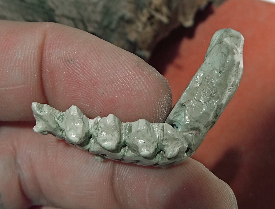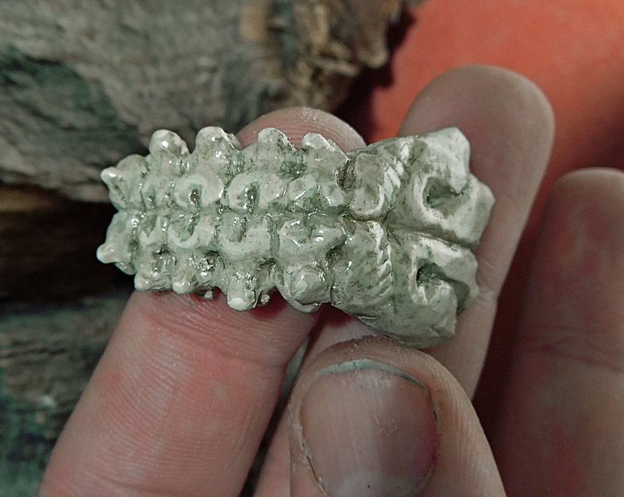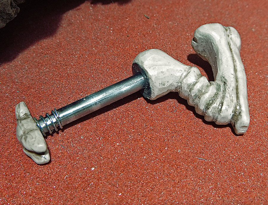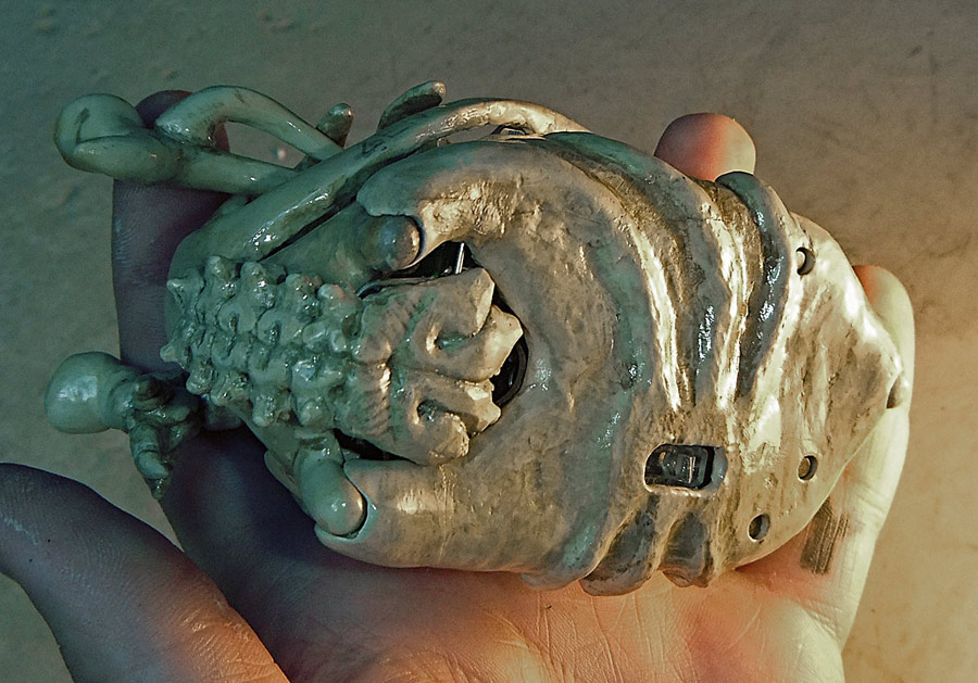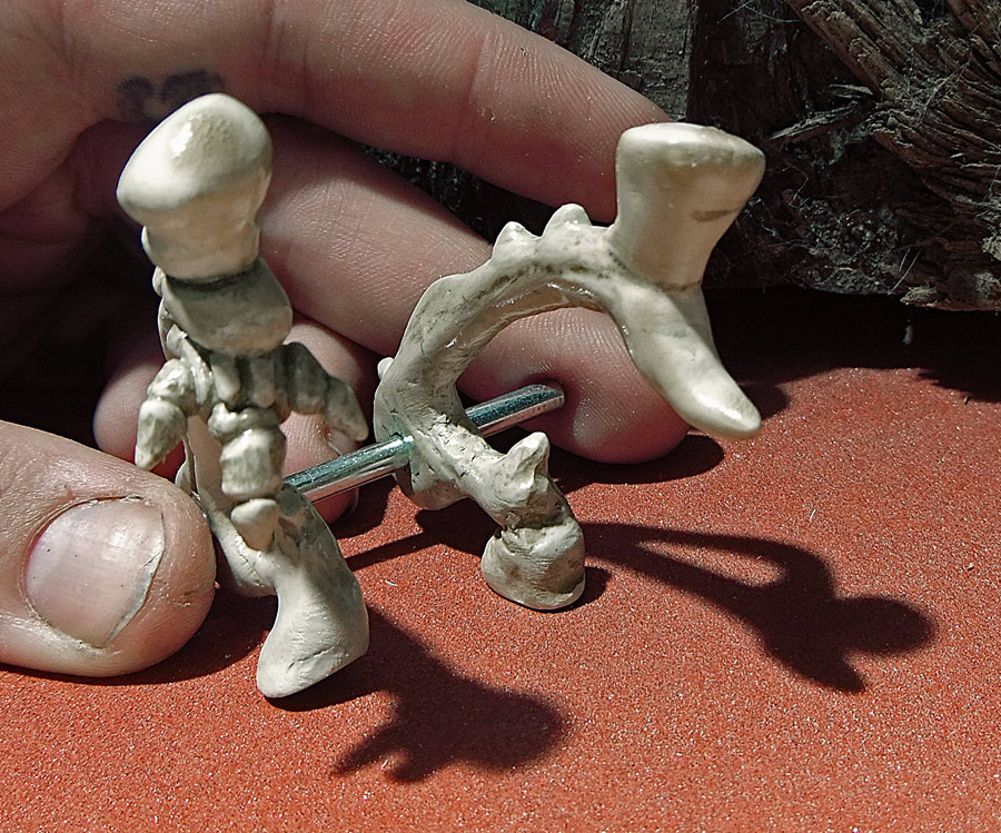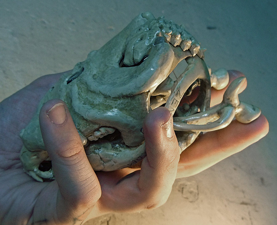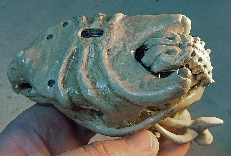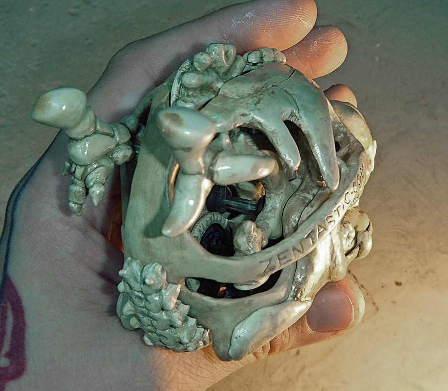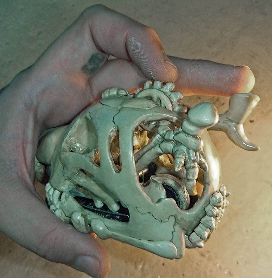 All the pictures in this entry (and after the break there are a small mountain of them) can be clicked on to see it bigger. Let me also show you how nicely the skull fits in my hand. I have a small collection of skulls here, so after looking at which would fit the electronics I picked the one that was the most ergonomic. Assuming you don’t recognize the animal without flesh, that’s the skull of a small dog, and in the picture above you can see the real bone skull that I used as my master.