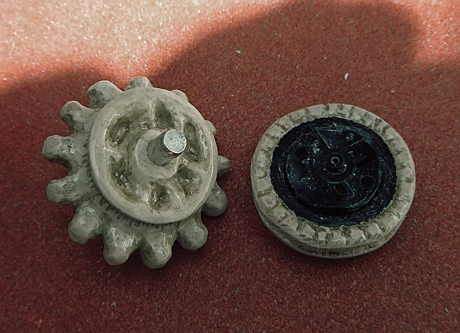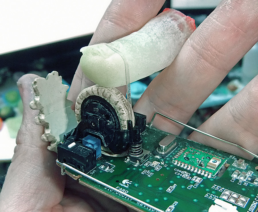 The scroll wheel is two parts, a big nubbed wheel that you turn with your finger that also has an attachment for the belt drive, and then the original scroll wheel. I’ve removed the rubber that the mouse comes with and replaced it with a faux bone wheel to accept the rubber band belt drive. You can see how that part fits onto the original location in the third photo.