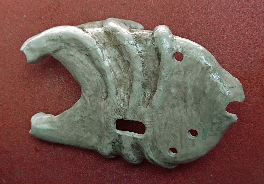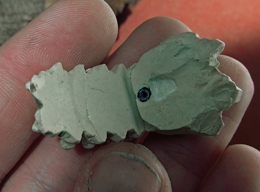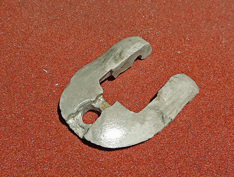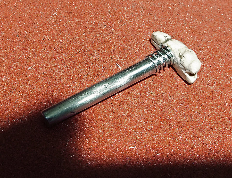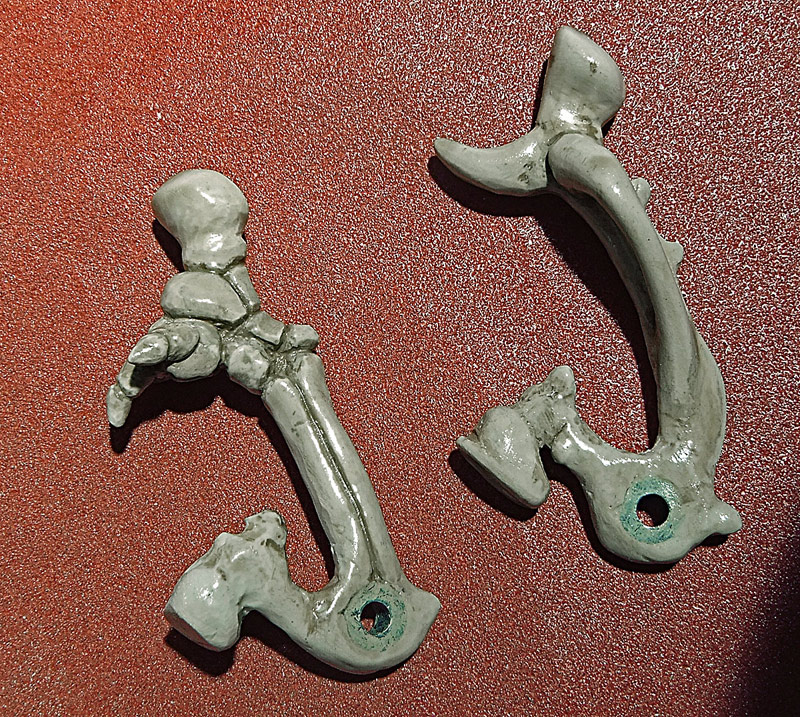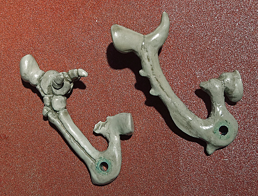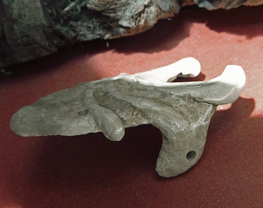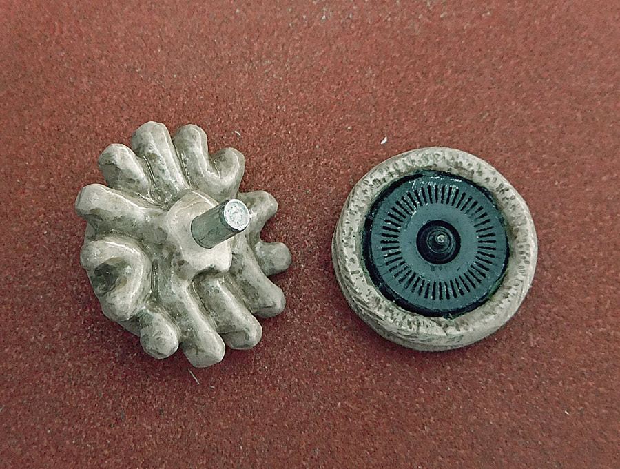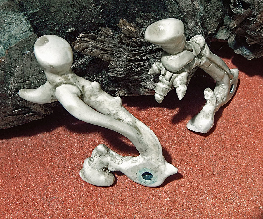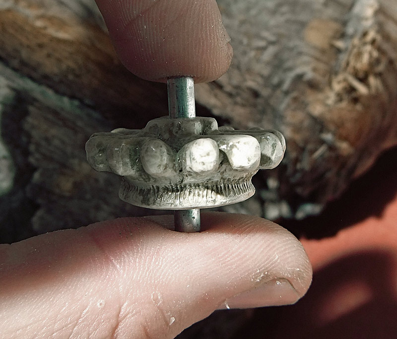 The main shell of the mouse (ie. the skull) is cast plastic, with the silicone mold being taken off a real skull (see that below). Everything else is made out of white Apoxie Clay (a two-part epoxy-type polymer clay). The parts are painted with Vallejo model acrylics with a base of ivory and then browns and yellows to age it, and then a clear high-temperature engine spray paint to protect it all. The shell by the way is not purely a copy. As you can see I have had to widen it a bit to fit the circuit board, and to make that look more interesting I’ve made multiple casts of the dog’s teeth and built a new jawline. I’ve also opened it up in the rear, added some “feet”, and all that. I’m sure it’s obvious. The last picture in the set (the U-shaped piece) is a cap that can be taken off in order to mount the scroll wheel and its button in a way that hides the axle.