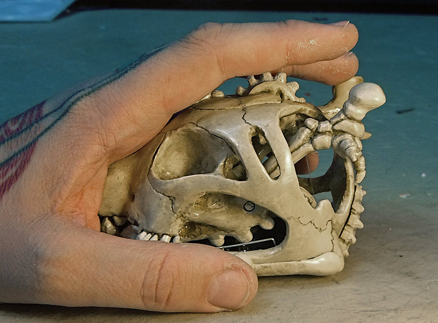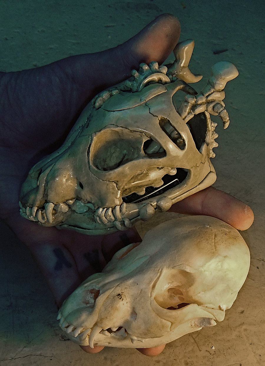 In today’s entry I want to share with you a guy that I made a couple weeks ago but have only gotten around to photographing now. I got a cheap grab-bag full of low grade geodes (twenty halved and polished geodes, roughly 1.5″ across on average, for about $20) and have been thinking of fun things to do with them, and the first thing I came up with was using the geode as a mouth for a funny character. I made this fellow using an Oco geode from Brazil that had a nice big quartz snaggle tooth. I sculpted the face in “Aves FixIt” (a two-part epoxy clay) and the hair is a section of a sheep hide that I got at Ikea. I glued the leather to the clay, and then sculpted a small lip over top of the edge of the leather in order to hide it. This was quite successful, and the original hair was totally crazy looking and very long, but in the end I cut it to a third its initial length and added a hat, mostly to keep the hair from being the focal point.