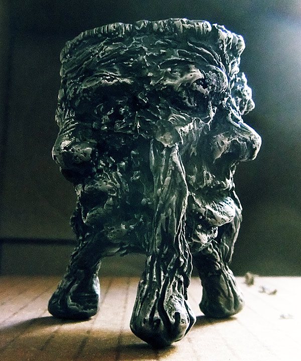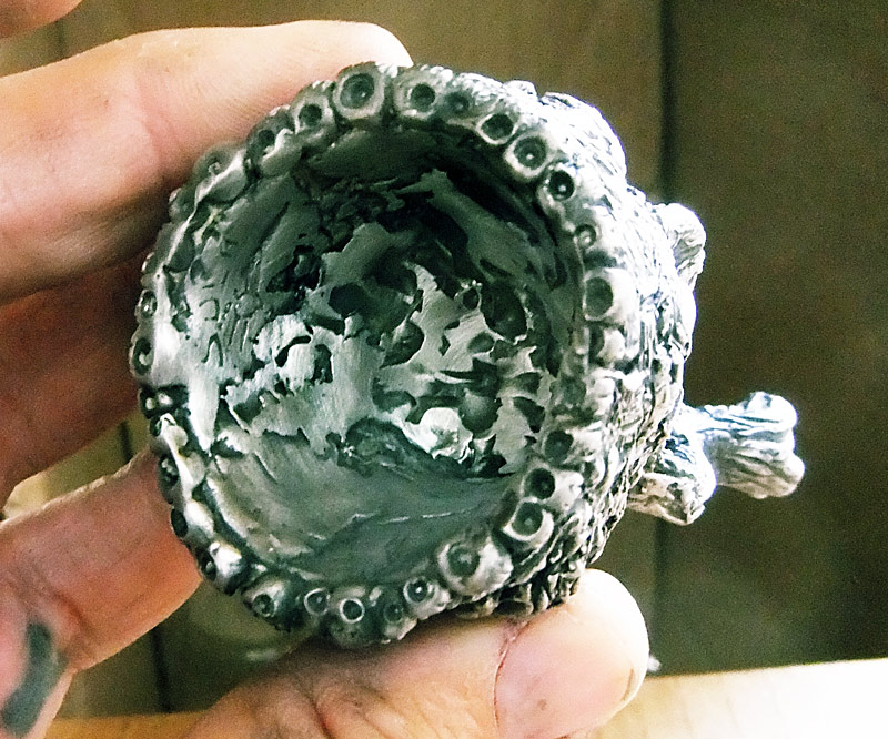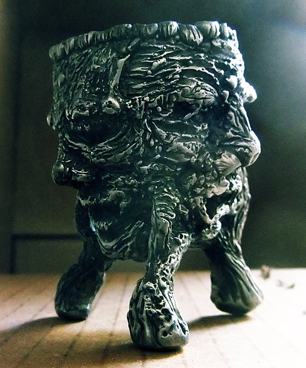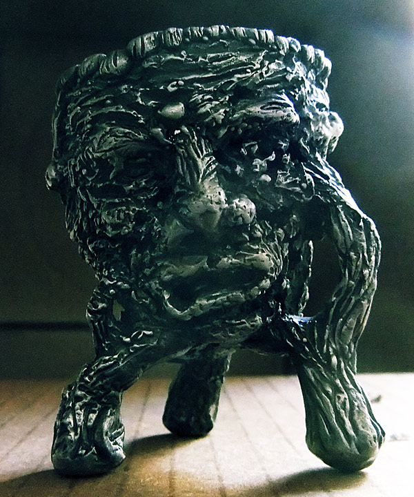 While on the trip, I had along a chipmunk and I asked Caitlin and Nefarious how I should change it (I’ve been doing one-offs in plastic that I have posted in previous entries… I’m not sure if I’m going to go back and take molds off them or not) and they told me that I should make it out of wood. So wood it is — half faux wood, with leaves for ears, and a patch of mushrooms growing on the top of the head for hair. With that Gaia-vibe, I’ve also put a globe on the back of the head.