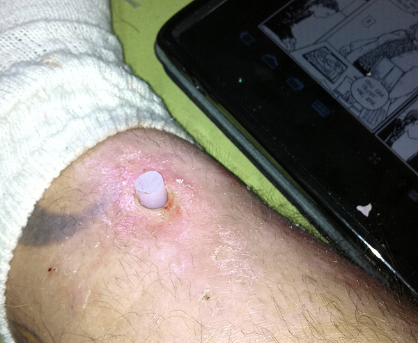 I have other neurological symptoms that I don’t feel like talking about right now but they also link with the same regions of the brain. I don’t want to hope that I’m having a nervous breakdown, but I really, really hope that I am. I would much rather that this be a treatable psychiatric symptom due to stress or pain beating on me, than have it be the other options. Option two is that it’s related to my central apnea. I am told that people with regular oxygen deprivation can hover on or straddle the line between asleep and awake. As I have already written here, I have been feeling more and more like my dream world and my waking world are intersecting, so maybe that’s true — I am slipping into a dream state in my waking life. The third option is the least pleasant. My doctor tells me that the embryonic tissue that forms muscle is the same tissue that forms brain matter, so when someone has a genetic problem with one, it’s not unusual for it to cross over. Since I have a known genetic abnormality causing my muscles to be replaced with calcium grids, I could have a similar progressive brain damage. I hope that’s a long shot, but just like it took hold in my thighs and spread from there in the muscle, it may be taking hold in the temporal lobe and spreading from there in the brain. Hopefully I’m just stressed out though.