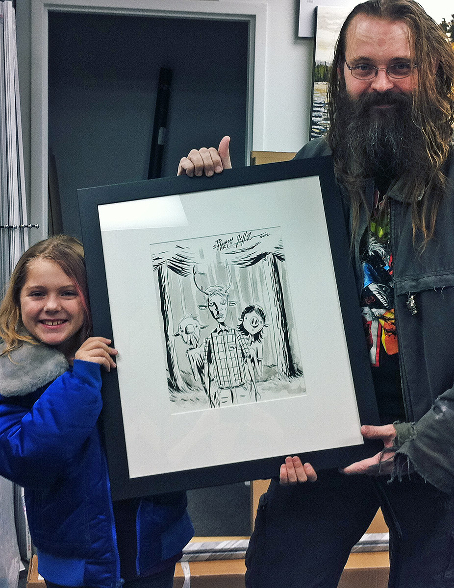 Anyway, I had a wonderful visit from my daughter, beginning rather late on Thursday night due to an extremely delayed flight. I was extremely happy to show her that Jeff Lemire, the artist and writer behind the brilliant comic “Sweet Tooth” that we both enjoy had sent us a gift of an original drawing of the main characters of his comic (which I again must highly recommend). First thing on Friday we took it to be framed, and then visited the doctor to deal with a lagging “hundred day cough” that she’s stuck with. After that we stopped by her old school to say hello to all her friends and teacher, and were thrilled to discover that it was the pre-March Break “Game Day” and she was invited to spend the rest of the day there — I don’t know if she was more excited or her classmates were, but they were all on cloud nine. Then at the end of the day we took the subway downtown, picked up some Cotton Candy Pink Manic Panic hair dye, had sushi for supper, and went to see the live show “Potted Potter“. She was shrieking with laughter for the entire show and even got called up on stage to be one of the seekers in a game of Quiddich!