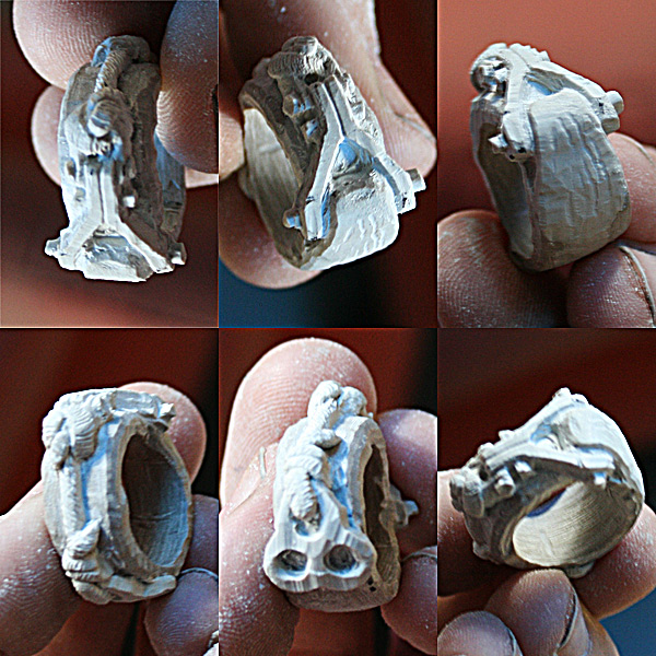 For whatever reason work wasn’t going well today. Not badly, just slowly. But I did make two very nice rings, a simple skull ring of my classic type with aventurine eyes, and a vampire skull ring with beautiful sapphire eyes and a great glowing citrine on the back that sits in the middle of a massive engraved spiral that fills the whole back of the ring. The lower jaw has been left off and I have carved monster/vampire teeth into the uppers as well. The funny part of the story is the reason I did it like that is because when I was mounting the eyes I wasn’t paying attention and hit the jaw with my soldering iron and melted part of it off… so I just ran with it.