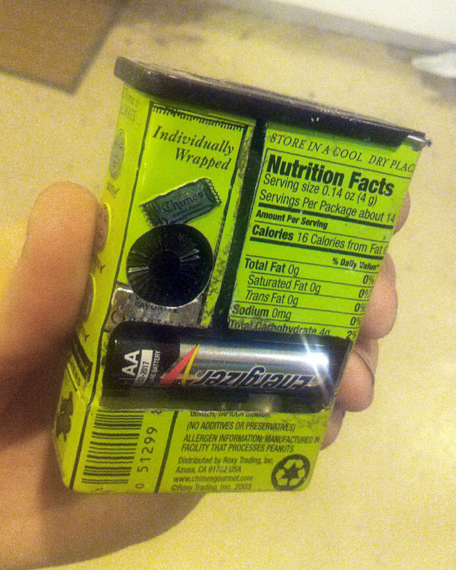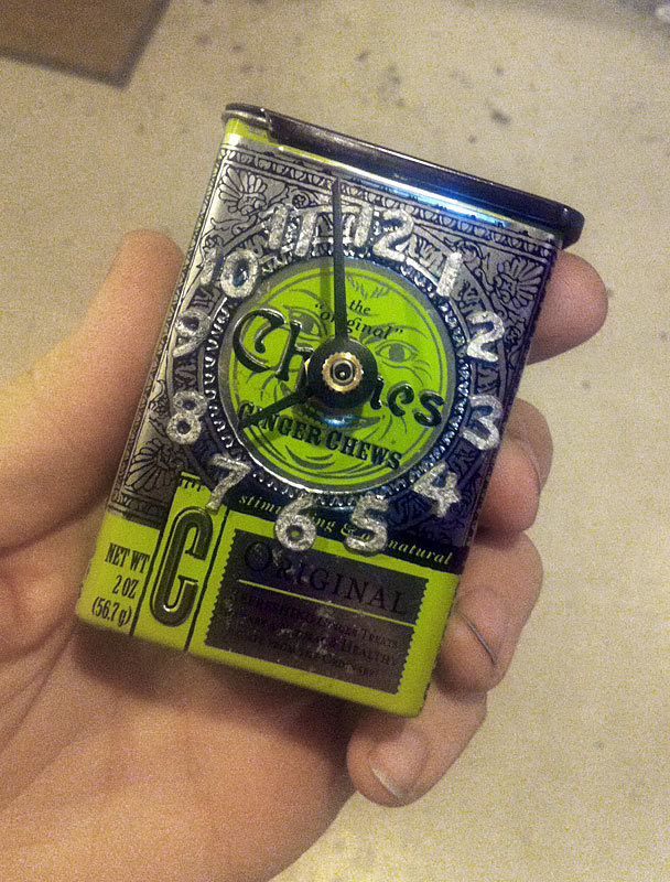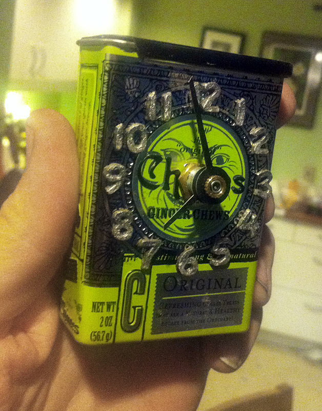I realized recently as I was cleaning up around my workspace that I never (at least I don’t think I did) took pictures of this little clock that I made. I actually bought these terrible tasting candies just because I liked the container and knew it would make a good clock! The innards are a standard battery powered clock mechanism, and I cut down the hands that came with it to better fit. The raised numbers are hand sculpted out of polymer clay and glued in space.
