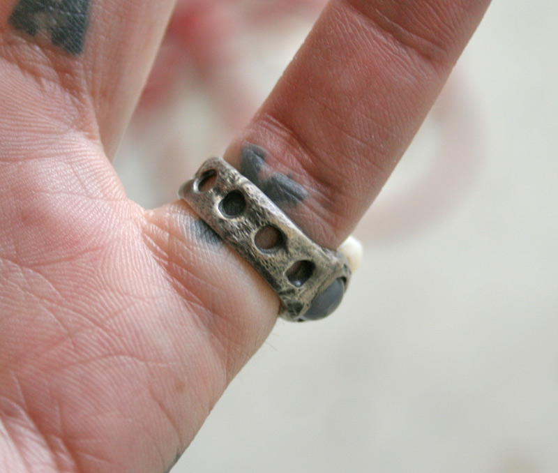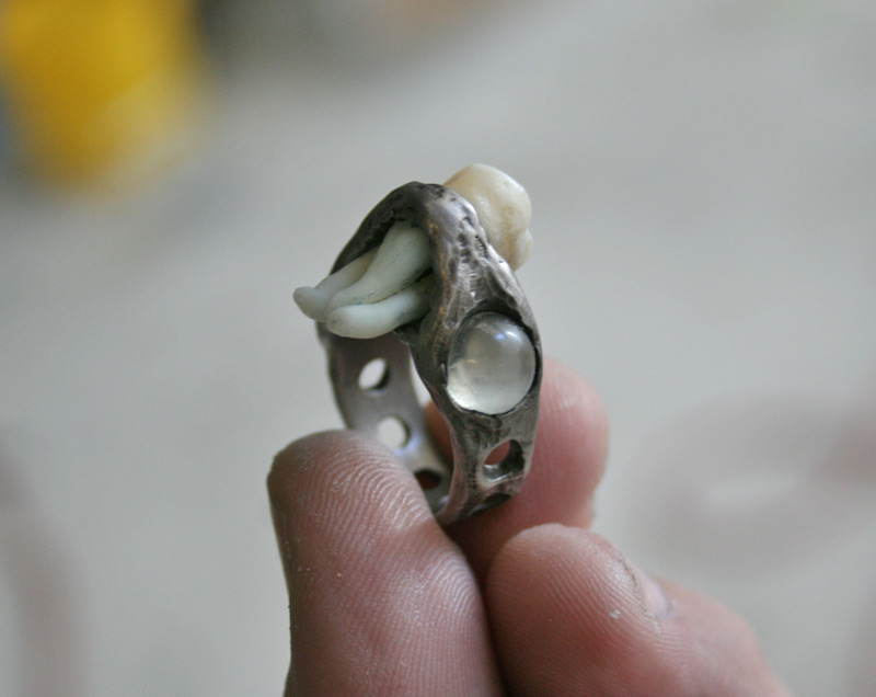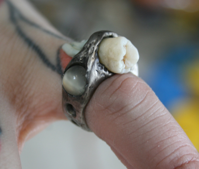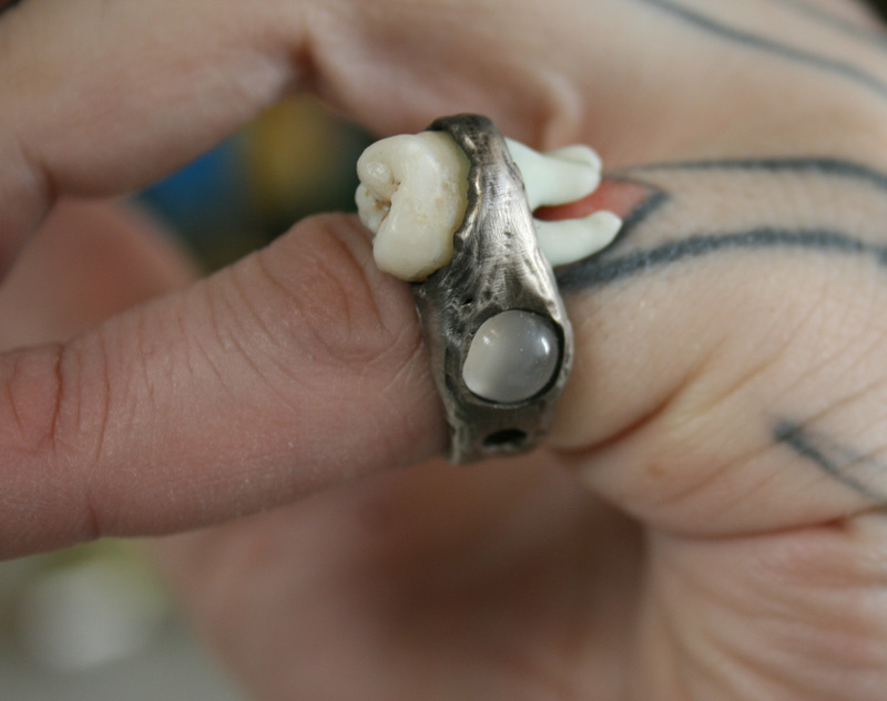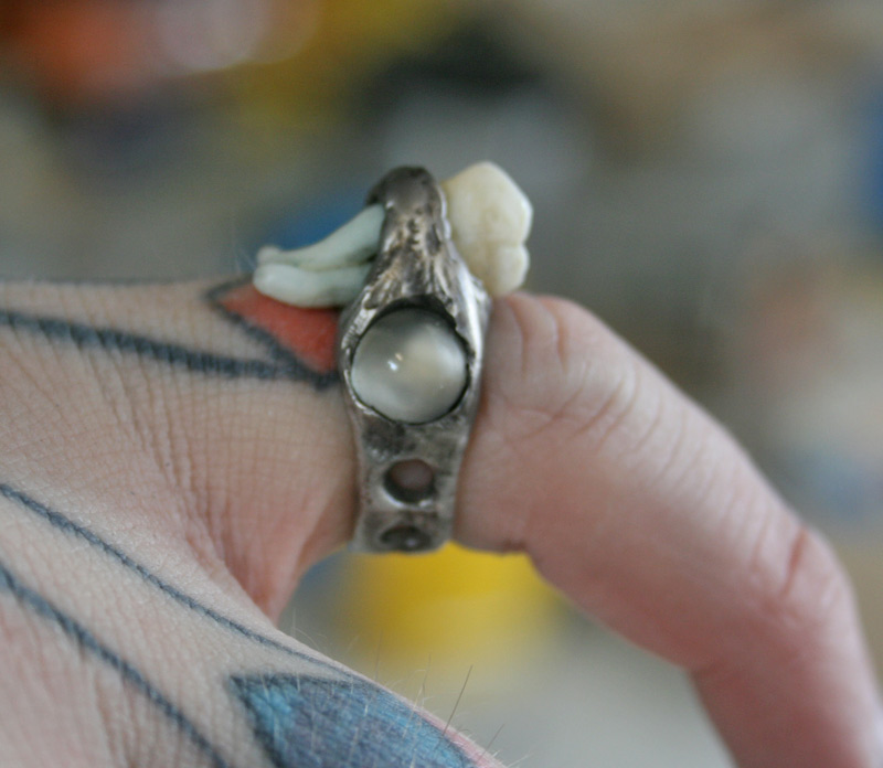 Quite a while ago she gave me permission to use her wisdom teeth (appropriate for her reaching a “wise-old age”) that have been sitting in a jar of alcohol since she had them yanked out. So for a birthday present I spent some time welding and carving metal (this is all hand-formed, not cast like most of my rings) into a ring that holds the tooth along with a pair of moonstones.