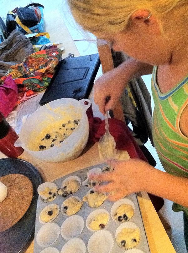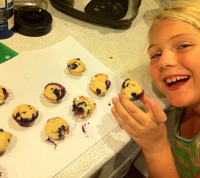 I’ve been working on building up Nefarious’s confidence, and on the “free parenting” meme that I have always advocated, I have let her go out a couple times on neighborhood errands for me, buying things from the corner store and so on. Nothing dangerous, nothing too ambitious for now, but enough to make her feel very proud and know she’s accomplished something independent. Also, because as you may recall one of the problems with her health was that she wasn’t eating good food, Caitlin got her a nice introductory cookbook, and she’s been having a ton of fun (and I think feeling really good about herself) cooking various dishes. Because her mother has MS and is often under the weather, she’s looking forward to helping her out with things like this when the school year resumes. This week she’s made — with Caitlin’s help and a little from me — baked macaroni and sloppy joes from scratch, ranch dressing, yogurt-and-berry parfait, some sort of mega popsicles, and today she made delcious mini blueberry muffins.