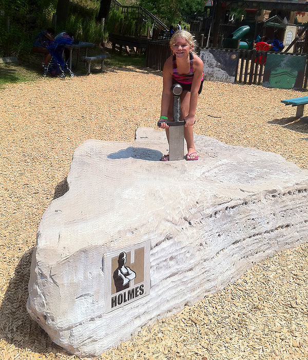 The color is a little boring right now but a few weeks ago kids and community members painted five hundred shields with feel-good slogans and pictures. This echoes some of the community art that is already up in the park from when it was first built. Going with the medieval theme, there’s also a fun “sword in the stone” at the entrance that every single parent has forced their kids to pull on for a photograph!