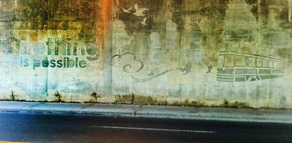 Oh — here’s a picture that maybe someone can explain to me. It’s part of a giant mural promoting Toronto down at the bottom of Parkside (Keele). We see it every time we walk to the pool. I have not taken it out of context or selectively cropped it. I can not wrap my head around how it can be something positive — “nothing is possible”… Hmmm… I would understand “nothing is impossible” or “everything is possible”, but this seems like a bit of a downer.